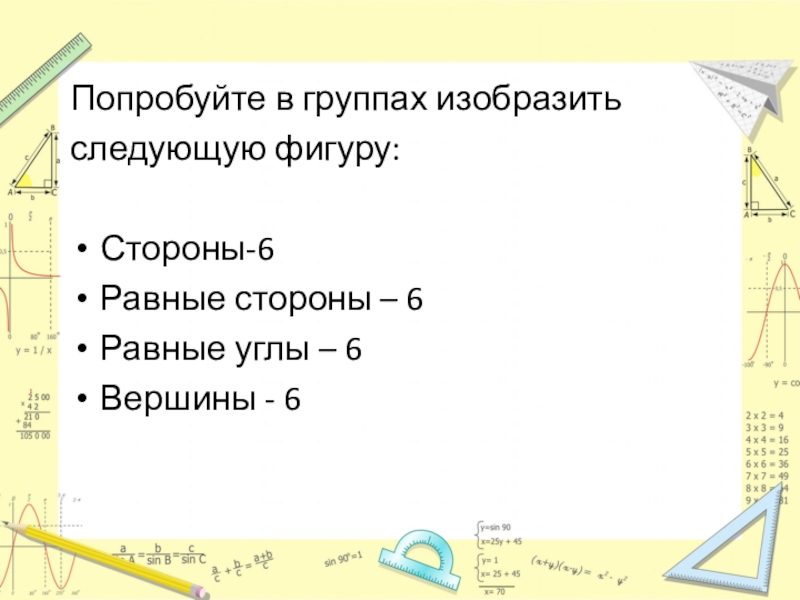 Попробуйте в группах изобразитьследующую фигуру:Стороны-6Равные стороны – 6Равные углы – 6Вершины - 6