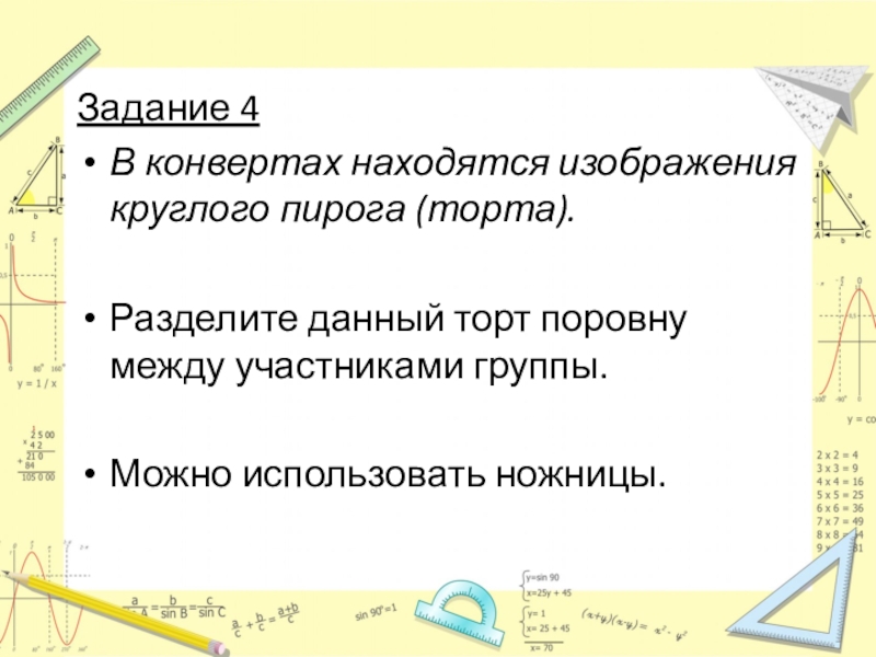 Задание 4В конвертах находятся изображения круглого пирога (торта).Разделите данный торт поровну между участниками группы.Можно использовать ножницы.
