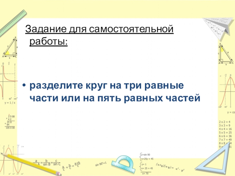 Задание для самостоятельной работы:разделите круг на три равные части или на пять равных частей