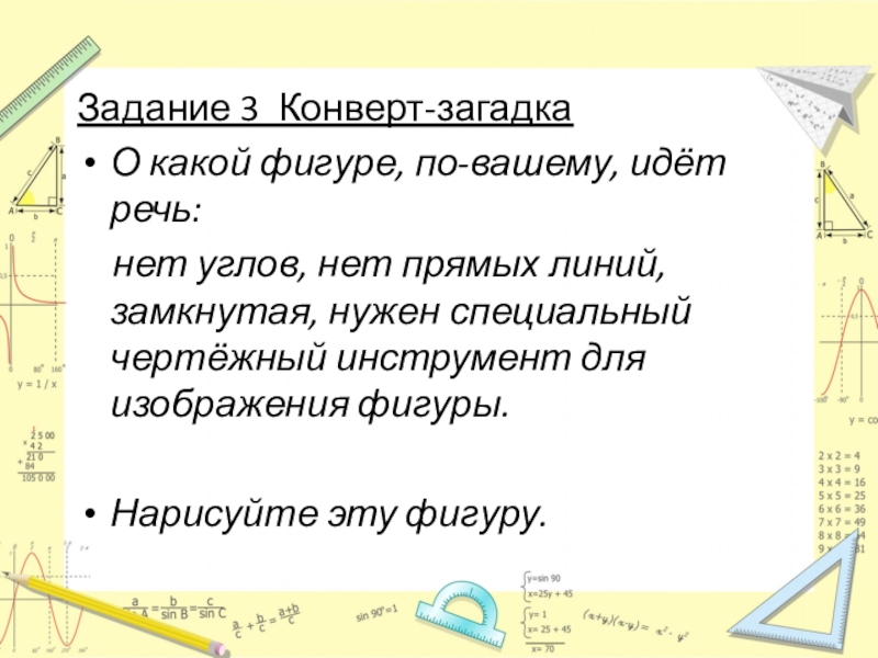 Задание 3 Конверт-загадкаО какой фигуре, по-вашему, идёт речь:   нет углов, нет прямых линий, замкнутая, нужен