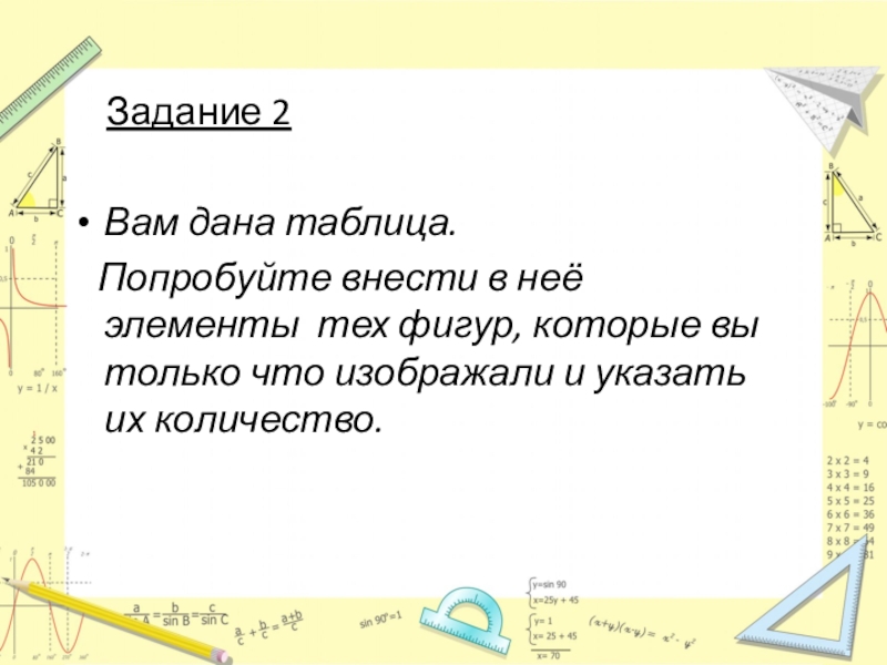 Задание 2Вам дана таблица.  Попробуйте внести в неё элементы тех фигур, которые вы только