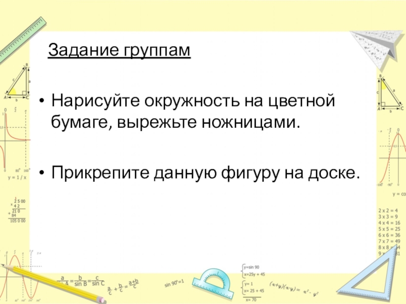 Задание группамНарисуйте окружность на цветной бумаге, вырежьте ножницами. Прикрепите данную фигуру на доске.