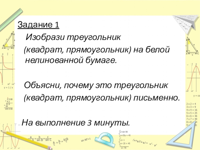 Задание 1 Изобрази треугольник (квадрат, прямоугольник) на белой нелинованной бумаге. Объясни, почему это треугольник (квадрат, прямоугольник) письменно. На выполнение 3 минуты.