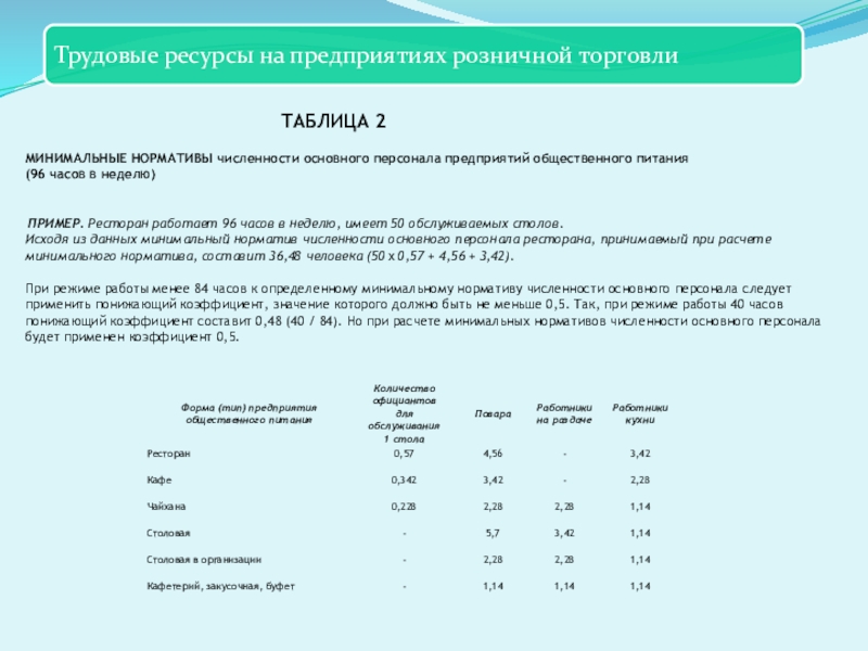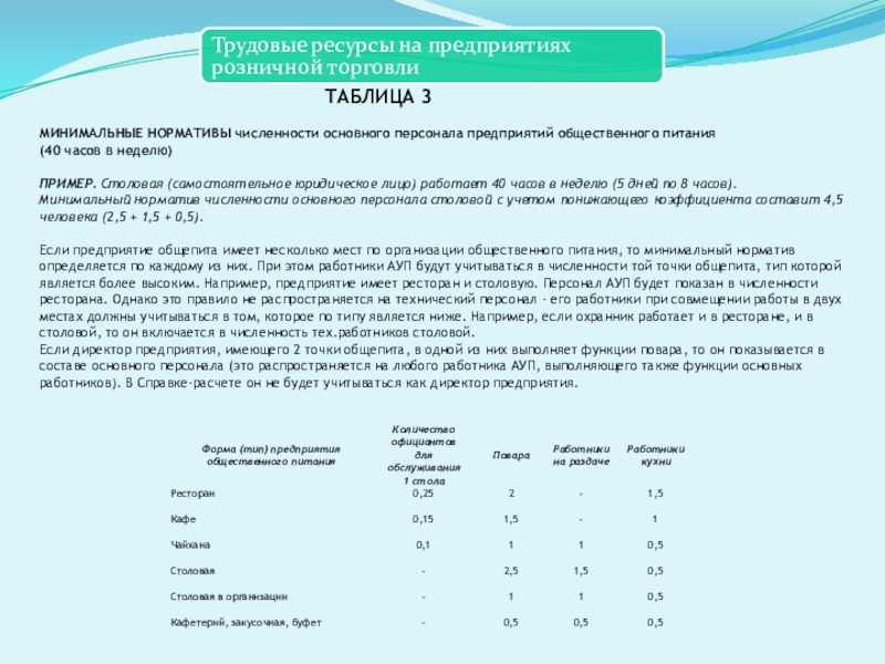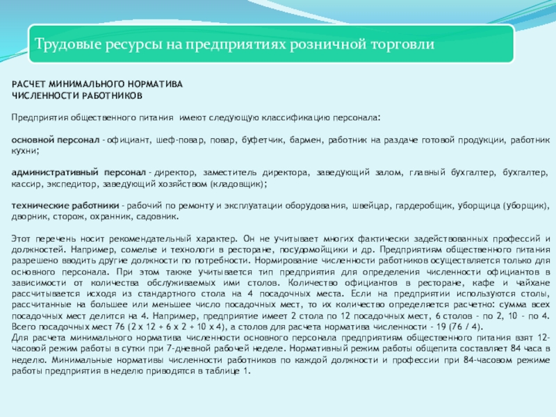 Следует отметить, что не все включенные в основной персонал работники учтены в этой таблице. Например, буфетчики и бармены, которые рекомендованы как основной персонал и подлежат нормированию в установленном порядке.