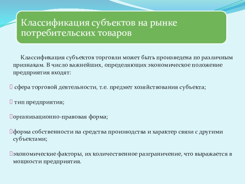 Классификация субъектов торговли может быть произведена по различным признакам. В число