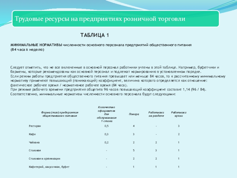 Для расчета минимального норматива численности основного персонала предприятиям общественного питания взят 12-часовой режим работы в сутки при 7-дневной рабочей неделе. Нормативный режим работы общепита составляет 84 часа в неделю. Минимальные нормативы численности работников по каждой должности и профессии при 84-часовом режиме работы предприятия в неделю приводятся в таблице 1.