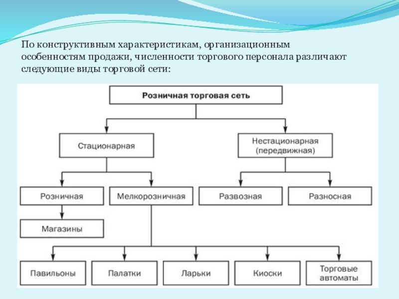 Слайд 6По конструктивным характеристикам, организационным особенностям продажи, численности торгового персонала различают следующие