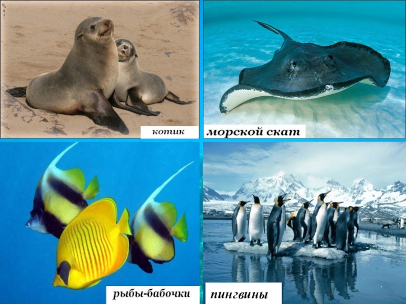 (кальмары, киты, водные змеи, черепахи, пингвины).