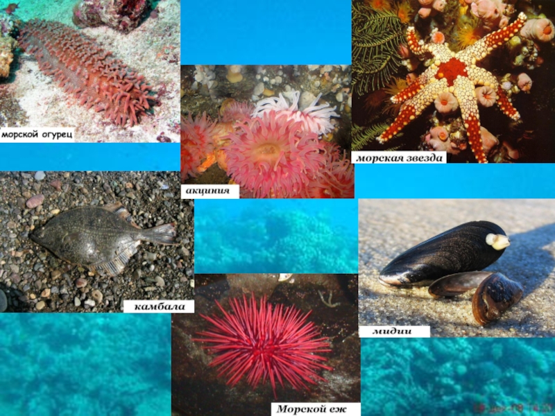 (морские звёзды, устрицы, мидии, рыба камбала)