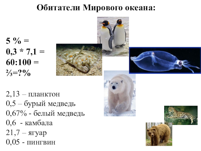 Обитатели Мирового океана: 5 % =0,3 * 7,1 =60:100 =⅔=?%2,13 – планктон0,5 – бурый