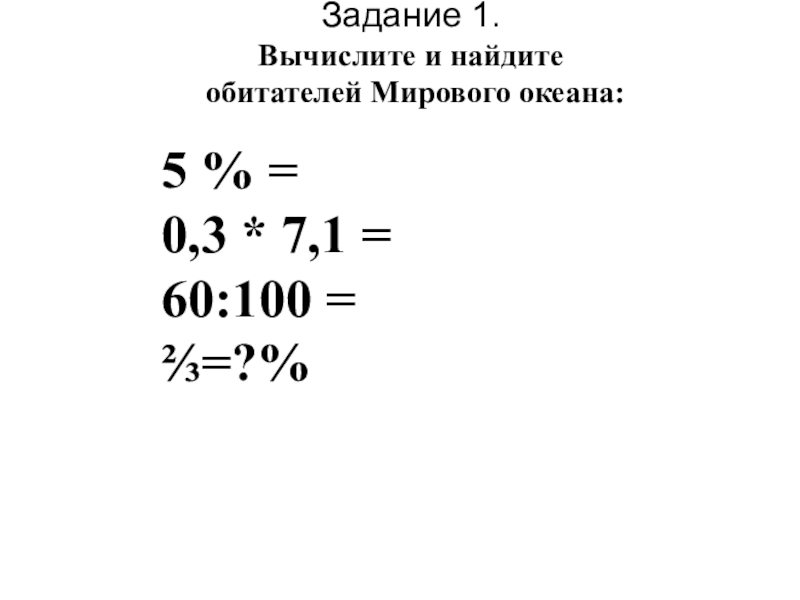 Задание 1. Вычислите и найдите   обитателей Мирового океана: 5 % =0,3 * 7,1 =60:100 =⅔=?%