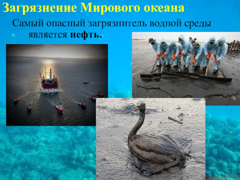 Загрязнение Мирового океанаСамый опасный загрязнитель водной среды является нефть.
