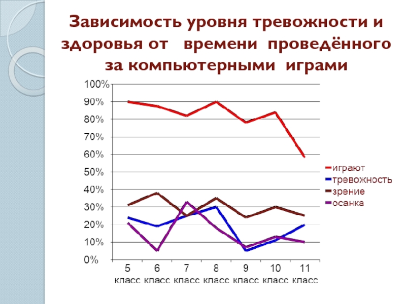 Слайд 14Зависимость уровня тревожности и здоровья от времени проведённого за компьютерными