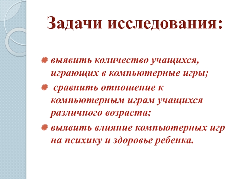Задачи исследования:выявить количество учащихся, играющих в компьютерные игры; сравнить отношение к компьютерным играм учащихся различного возраста;выявить влияние