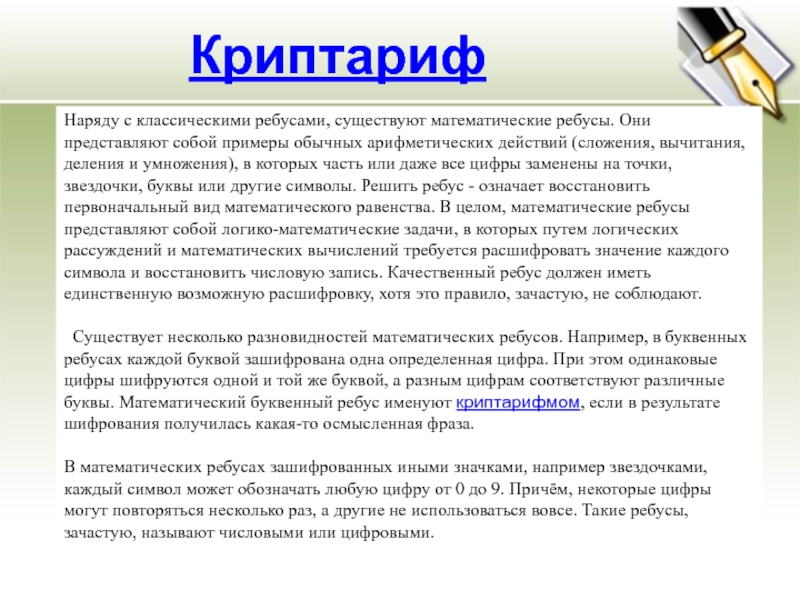 Существует несколько разновидностей математических ребусов. Например, в буквенных ребусах каждой буквой зашифрована одна определенная цифра. При этом одинаковые цифры шифруются одной и той же буквой, а разным цифрам соответствуют различные буквы. Математический буквенный ребус именуют криптарифмом, если в результате шифрования получилась какая-то осмысленная фраза.