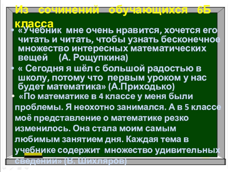 «По математике в 4 классе у меня были проблемы. Я неохотно занимался. А в 5 классе моё представление о математике резко изменилось. Она стала моим самым любимым занятием дня. Каждая тема в учебнике содержит множество удивительных сведений» (В. Шихляров)