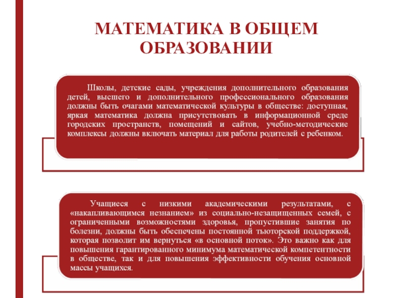 Заключается в том, чтобы математика в России стала передовой и привлекательной областью знания и деятельности, а получение математических знаний – осознанным и внутренне мотивированным процессом