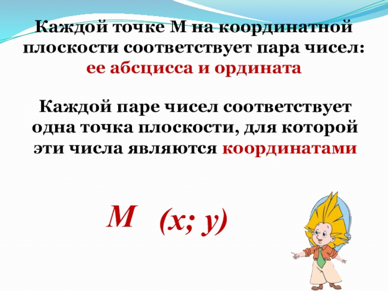 Каждой паре чисел соответствует одна точка плоскости, для которой эти числа являются координатами
