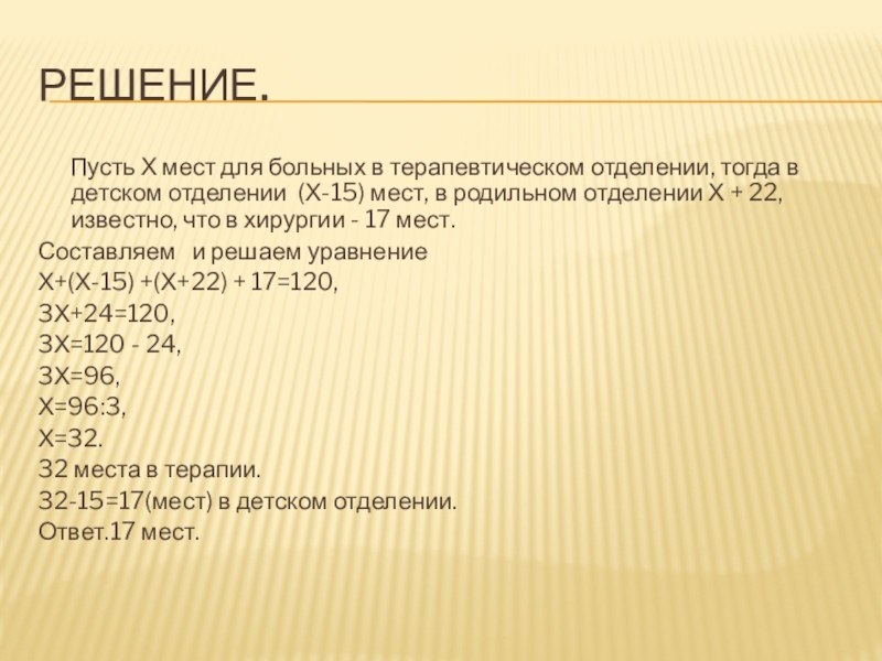 Одновременно больница могла принять до 120 больных. В хирургии могли находиться до 17 больных, В терапии на 15 мест для больных больше, чем в детском отделении, и на 22 места меньше, чем в родильном отделении. Сколько мест для приема больных в детском отделении?