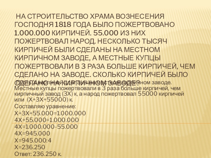 Пусть Х кирпичей сделаны на местном кирпичном заводе. Местные купцы пожертвовали в 3 раза больше кирпичей, чем кирпичный завод (3Х) к, а народ пожертвовал 55000 кирпичей или (Х+3Х+55000) к.