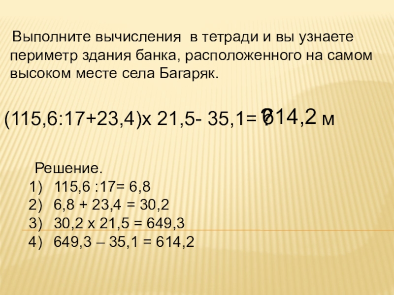 Выполните вычисления в тетради и вы узнаете периметр здания банка,