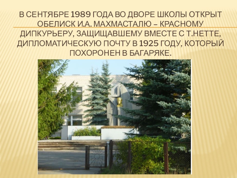В сентябре 1989 года во дворе школы открыт обелиск И.А. Махмасталю