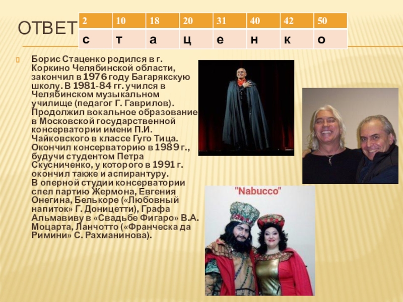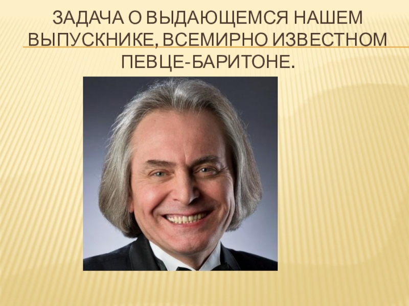 Слайд 24Задача о выдающемся нашем выпускнике, всемирно известном певце-баритоне.
