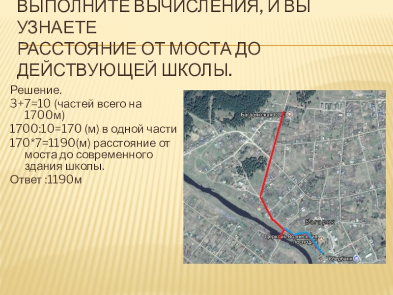 170*7=1190(м) расстояние от моста до современного здания школы.