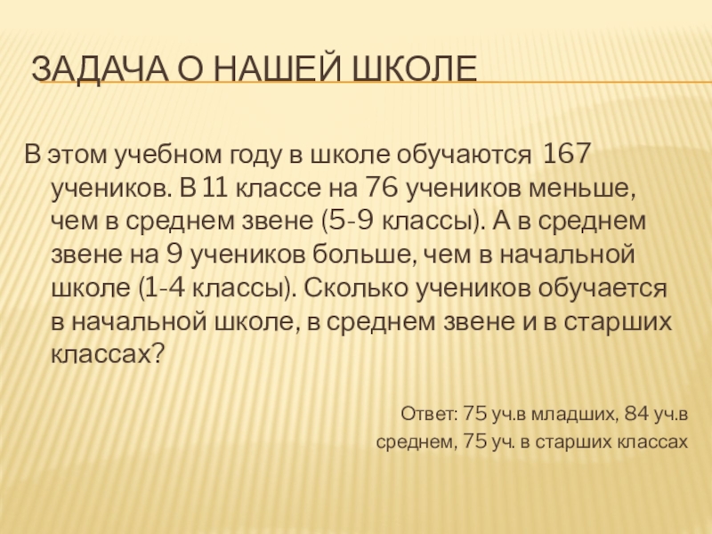 учеников. В 11 классе на 76 учеников меньше, чем в среднем звене (5-9 классы). А в среднем звене на 9 учеников больше, чем в начальной школе (1-4 классы). Сколько учеников обучается в начальной школе, в среднем звене и в старших классах?