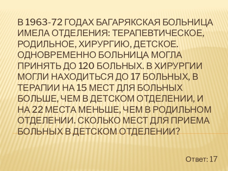 тогда в детском отделении (Х-15) мест, в родильном отделении Х + 22, известно, что в хирургии - 17 мест.