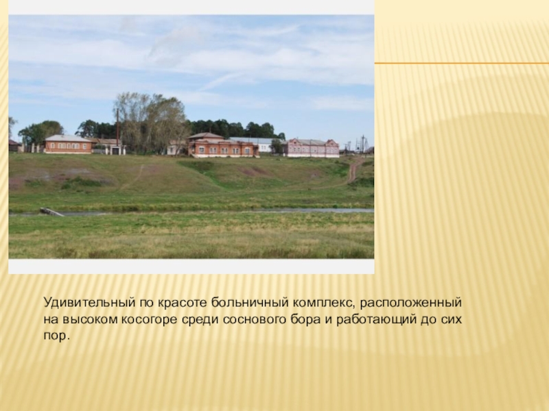 Слайд 14Удивительный по красоте больничный комплекс, расположенный на высоком косогоре среди соснового
