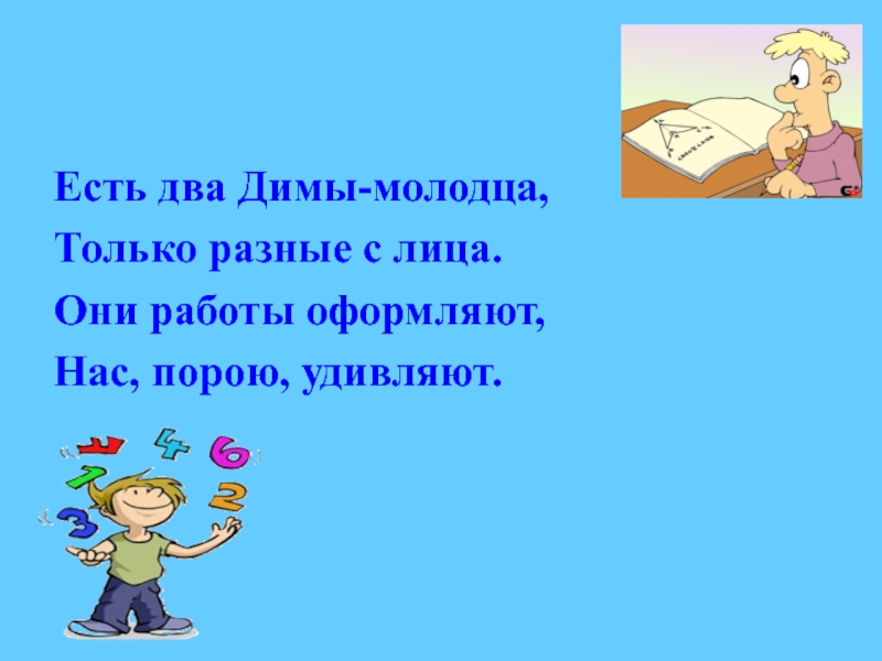 Есть два Димы-молодца,Только разные с лица.Они работы оформляют,Нас, порою, удивляют.