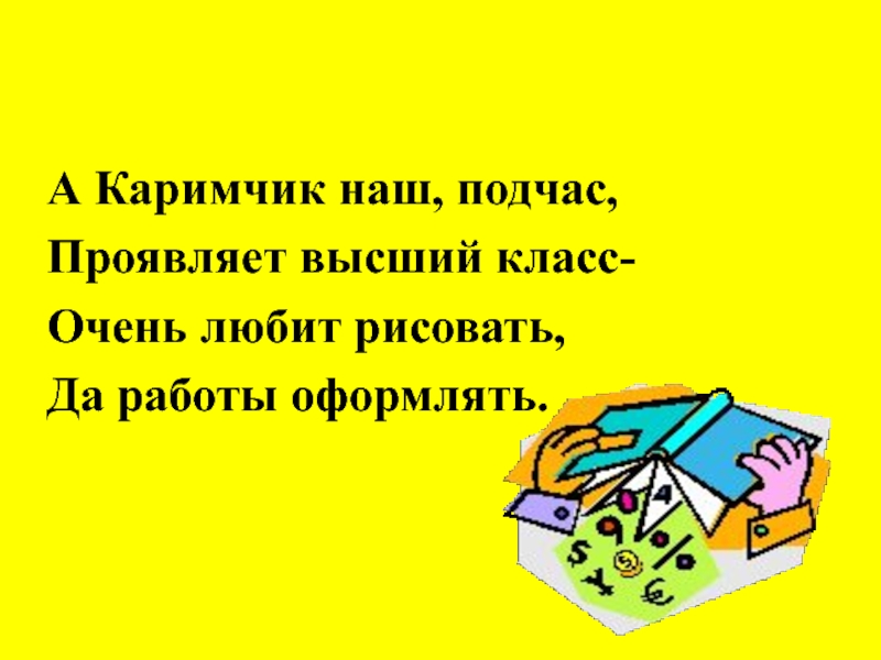 А Каримчик наш, подчас,Проявляет высший класс-Очень любит рисовать,Да работы оформлять.