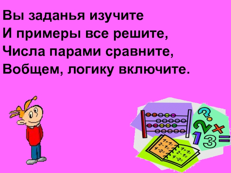 Вы заданья изучитеИ примеры все решите,Числа парами сравните,Вобщем, логику включите.