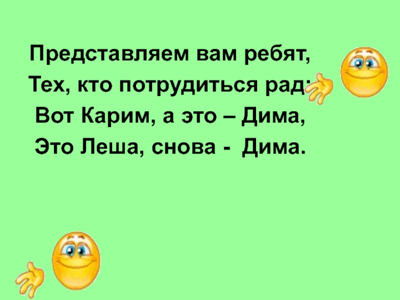 Представляем вам ребят, Тех, кто потрудиться рад:Вот Карим, а это – Дима, Это Леша, снова - Дима.