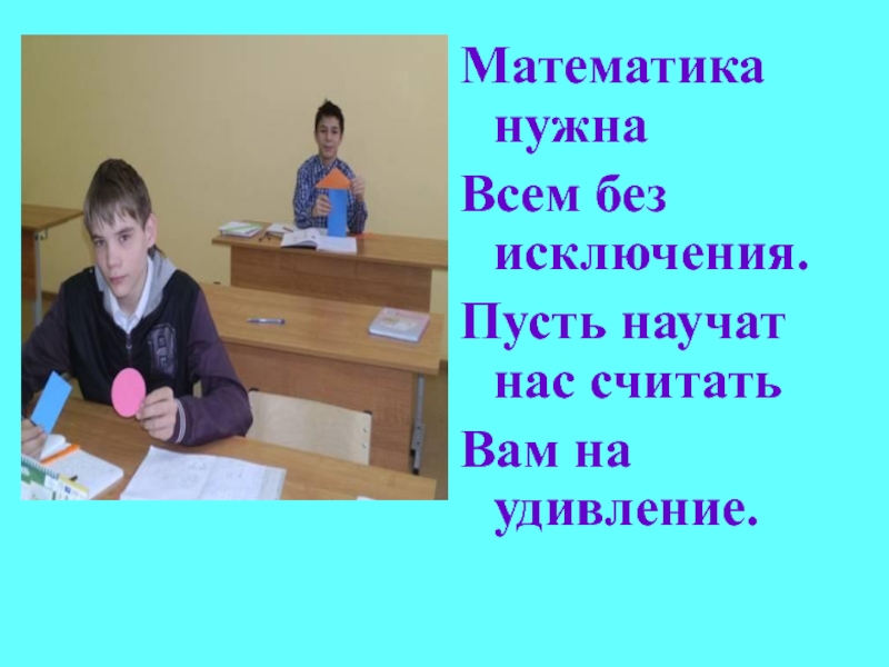 Математика    нужнаВсем без  исключения.Пусть научат нас считатьВам на удивление.