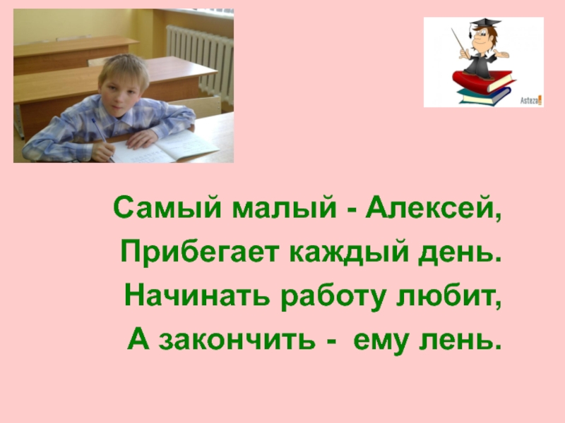 Самый малый - Алексей,Прибегает каждый день.Начинать работу любит, А закончить - ему лень.