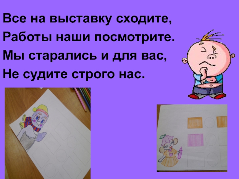Все на выставку сходите,Работы наши посмотрите.Мы старались и для вас,Не судите строго нас.