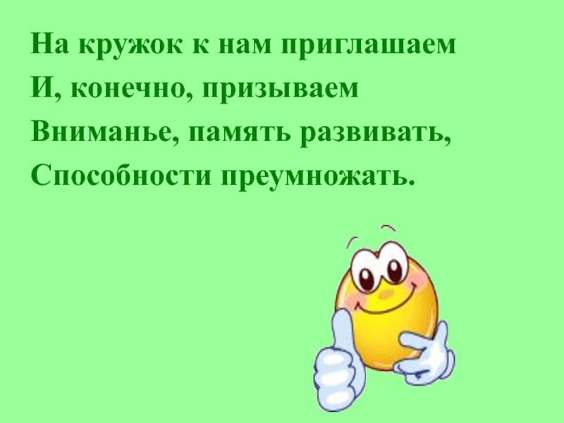 На кружок к нам приглашаем И, конечно, призываемВниманье, память развивать,Способности преумножать.
