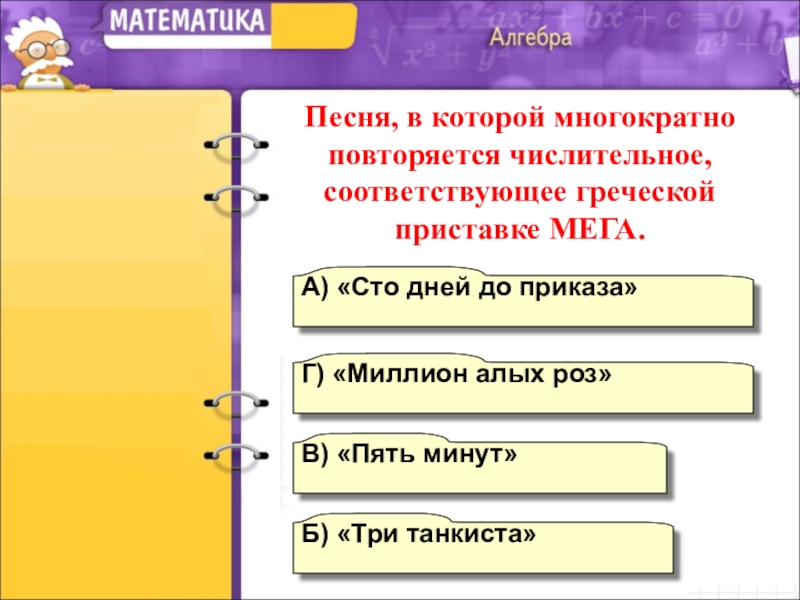 Песня, в которой многократно повторяется числительное, соответствующее греческой приставке МЕГА.
