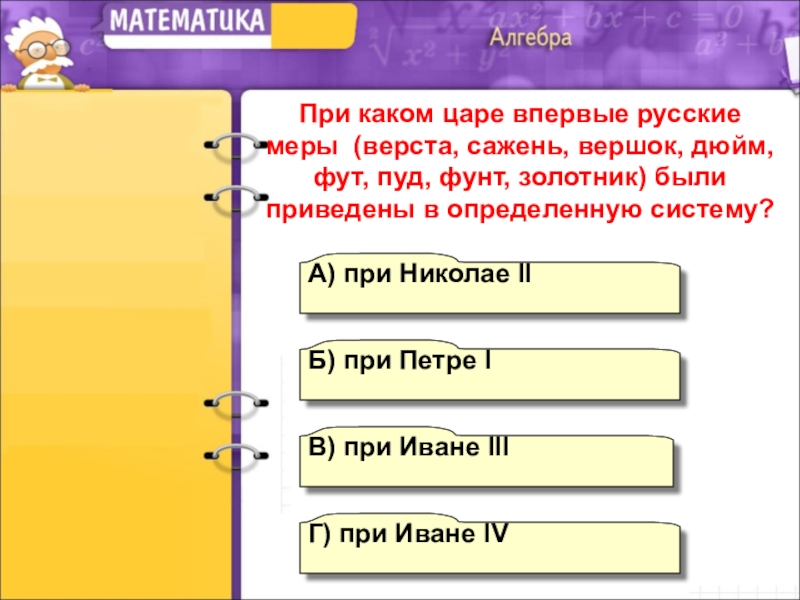 При каком царе впервые русские меры (верста, сажень, вершок, дюйм, фут, пуд, фунт, золотник) были приведены в определенную систему?