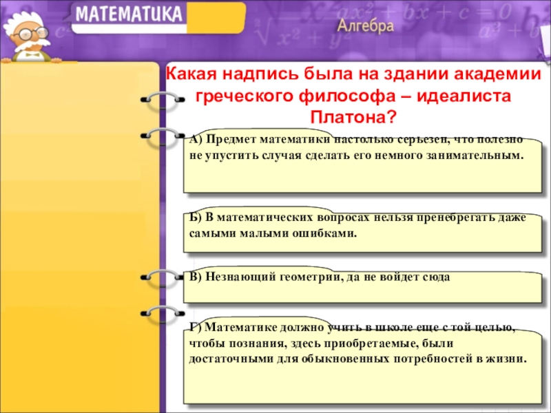 Какая надпись была на здании академии греческого философа – идеалиста Платона?