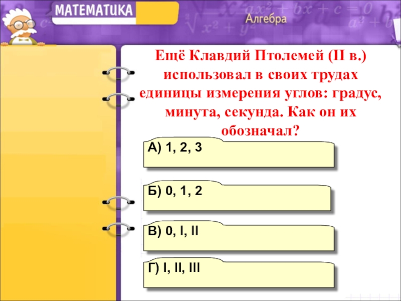 Ещё Клавдий Птолемей (II в.) использовал в своих трудах единицы измерения углов: градус, минута, секунда. Как он их обозначал?