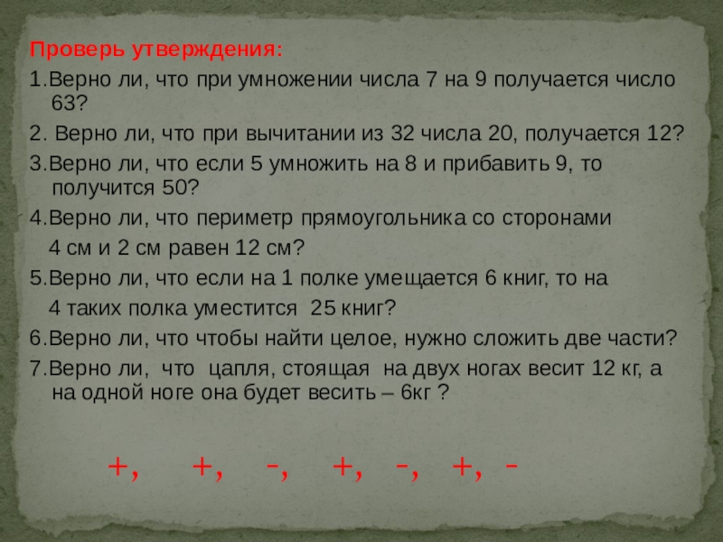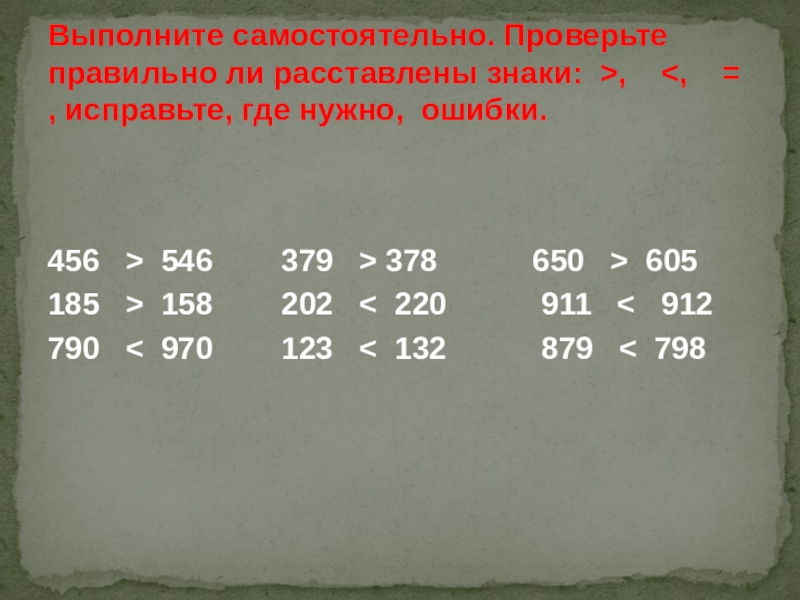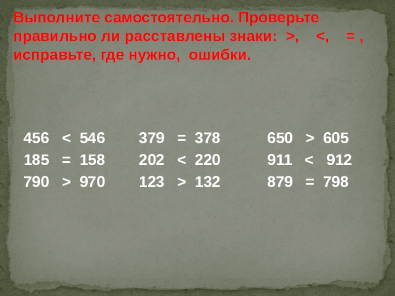 Выполните самостоятельно. Проверьте правильно ли расставлены знаки: >, <, = , исправьте, где нужно, ошибки.