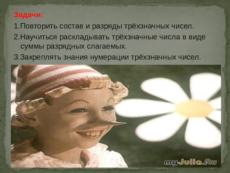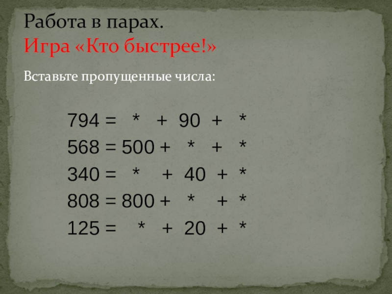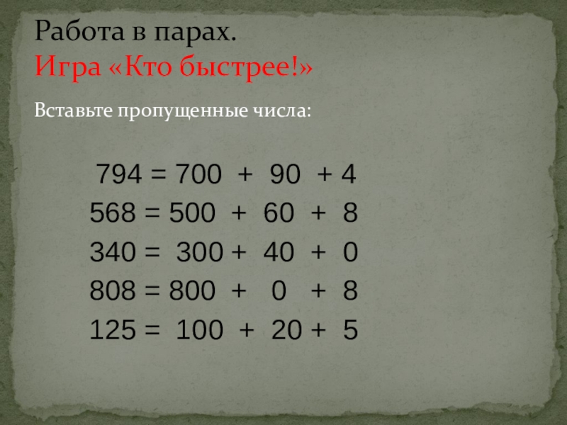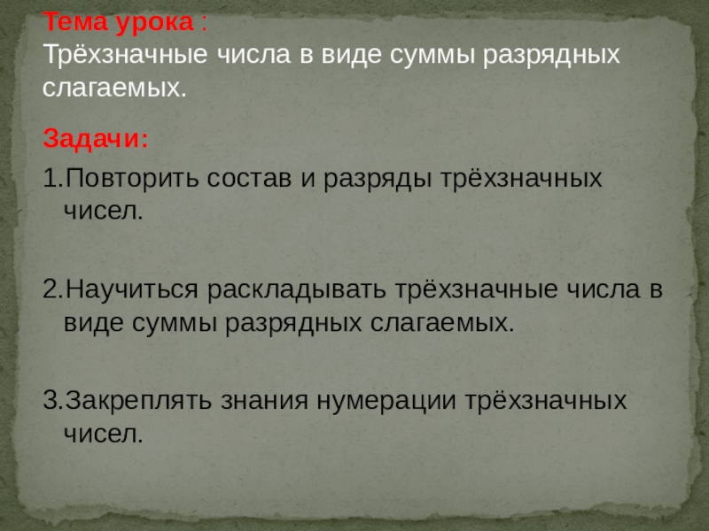 Трёхзначные числа в виде суммы разрядных слагаемых.