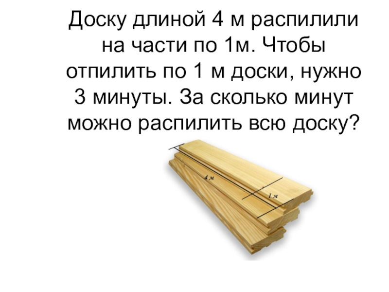 Слайд 8Доску длиной 4 м распилили на части по 1м. Чтобы отпилить