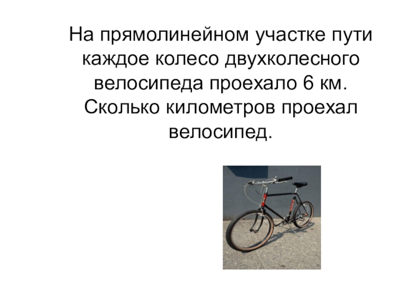Слайд 7На прямолинейном участке пути каждое колесо двухколесного велосипеда проехало 6 км.