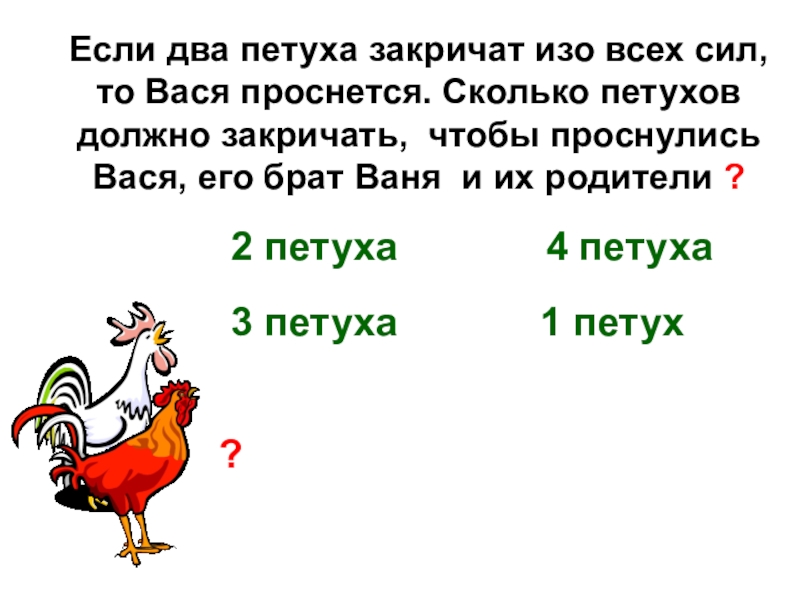 Слайд 14Если два петуха закричат изо всех сил, то Вася проснется. Сколько