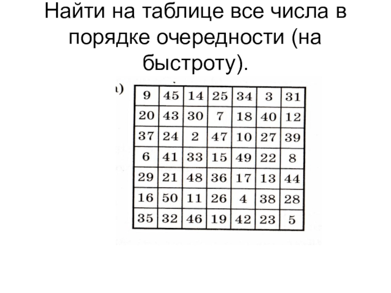 Слайд 15Найти на таблице все числа в порядке очередности (на быстроту).