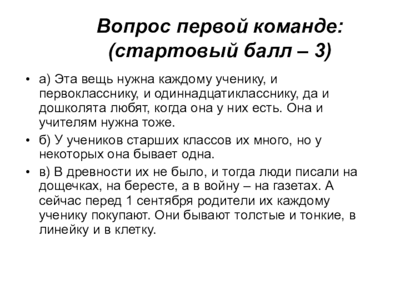 в) В древности их не было, и тогда люди писали на дощечках, на бересте, а в войну – на газетах. А сейчас перед 1 сентября родители их каждому ученику покупают. Они бывают толстые и тонкие, в линейку и в клетку.